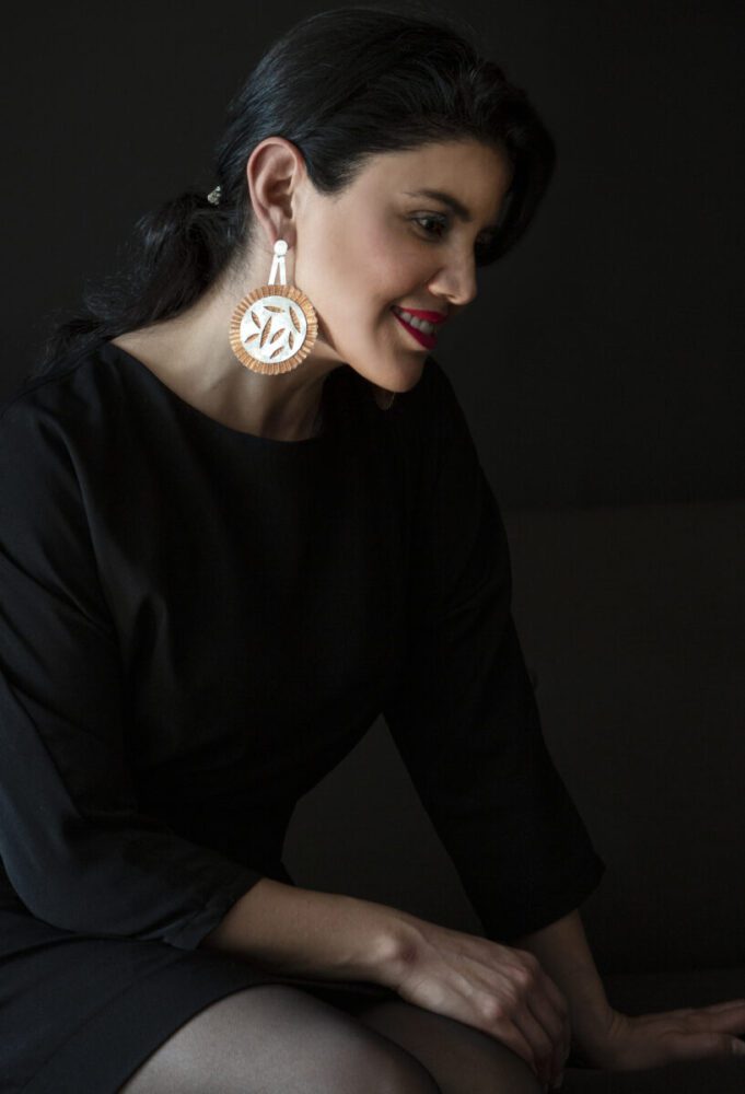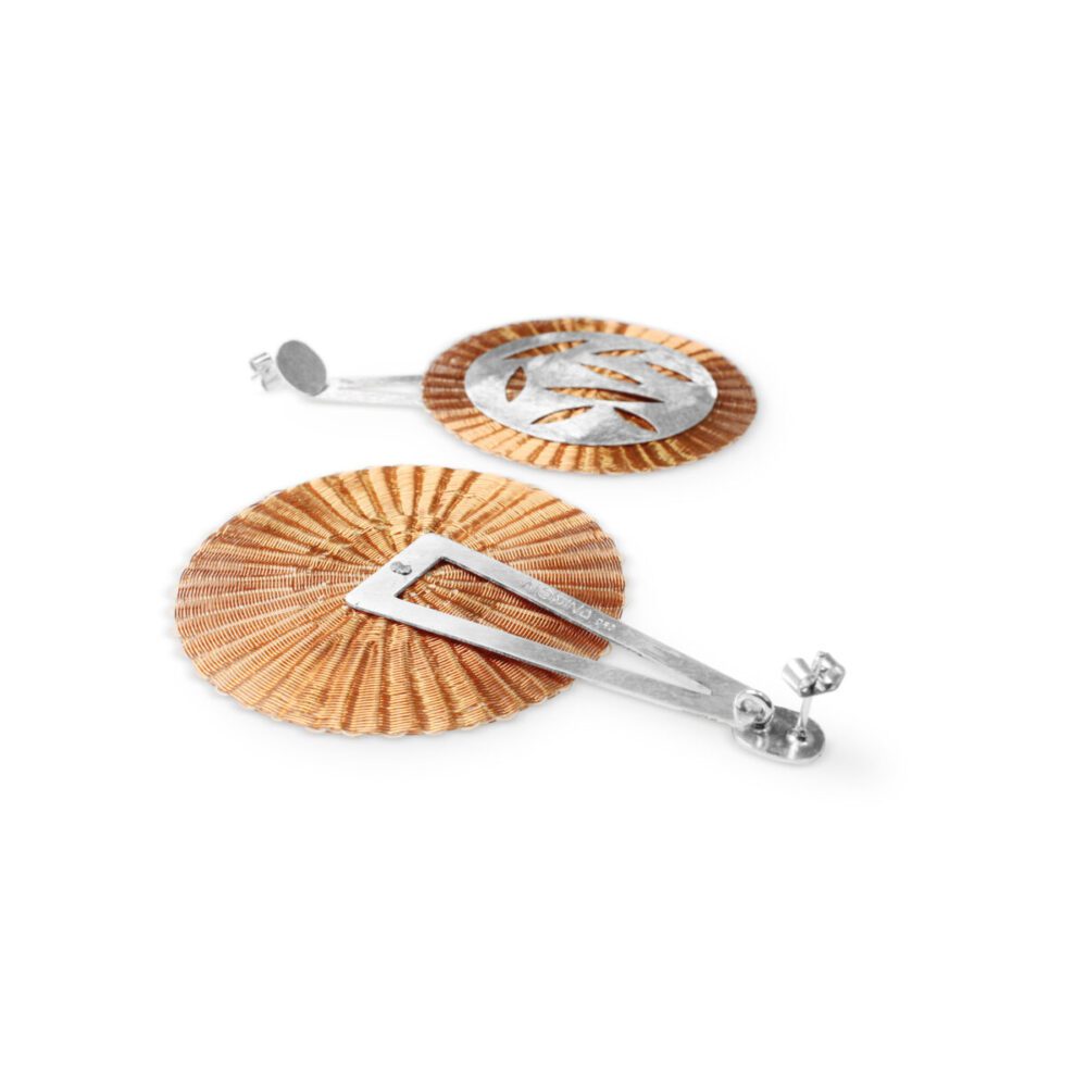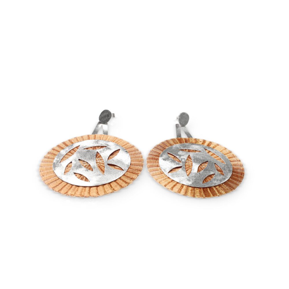 Aros de plata de 950 con dos discos tejidos en hilos de cobre